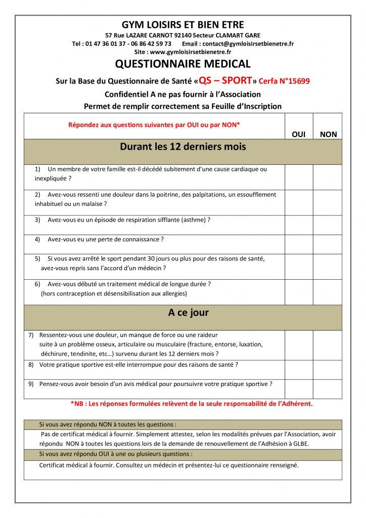 Pour des raisons de confidentialité, aucun questionnaire médical ne doit être communiqué au club.