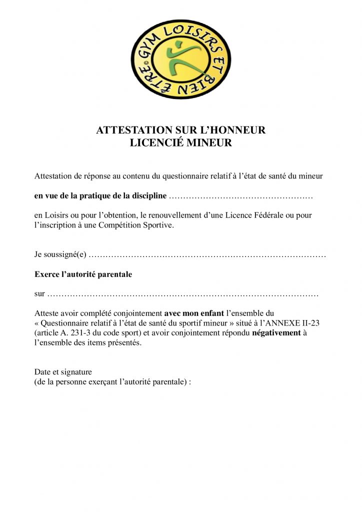 Le responsable légal du mineur, devra attester sur l’honneur auprès du club que chacune des rubriques du questionnaire donne lieu à une réponse négative.
